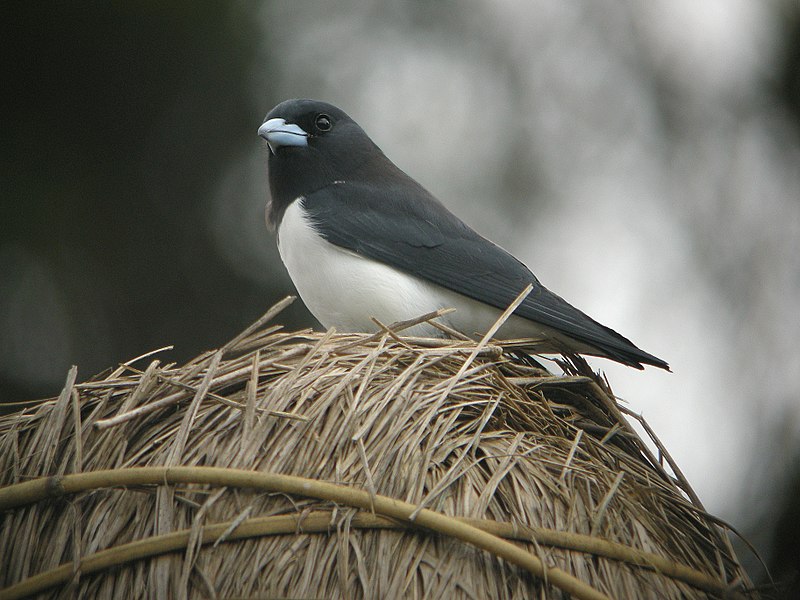 The white-breasted woodswallow is a medium-sized bird with a dark gray head and neck, dark blue-gray upperparts, tail and wings,and white underparts and underwings.