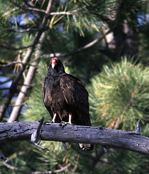 The turkey vulture is a scavenger. It only eats carrion. It soars over the land looking for dead animals. It flies at low altitudes with its wings in a V-shaped angle called a dihedral. As it flies, it rocks from side-to-side instead of flapping its wings. This saves energy and allows the turkey vulture to stay in the air longer. It also glides on thermals or updrafts of air.
