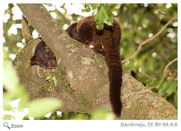 The brown palm civet is found in tropical rainforests along the western coast of India.